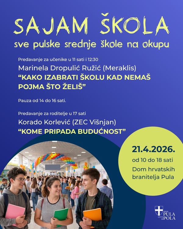 Grad Pula - Pola organizira Sajam srednjih škola koji će se održati u utorak, 21. travnja 2026. godine u Domu hrvatskih branitelja u Puli, u vremenu od 10 do 18 sati, uz pauzu od 14 do 16 sati…
