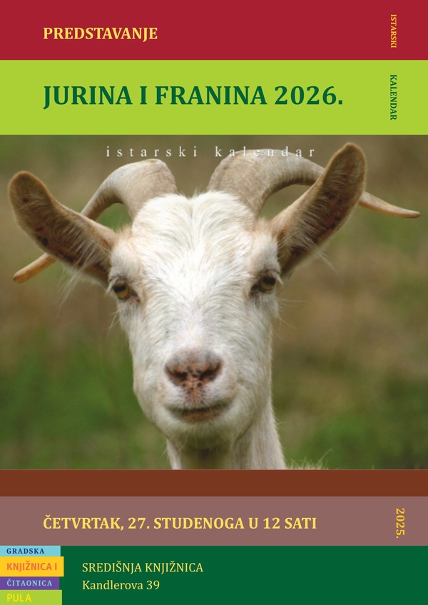Istarski kalendar Jurina i Franina za 2026. godinu bit će predstavljen u četvrtak, 27. studenoga 2025. u dvorani Gradske knjižnice i čitaonice Pula. Jurinu i Franinu će predstaviti Vanesa Begić, č…