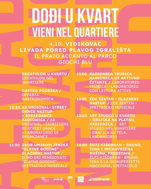 Livada pored plavog igrališta na Vidikovcu u subotu, 4. listopada, pretvorit će se u zabavni, kulturni i sportski centar zbivanja povodom manifestacije „Dođi u kvart – Vieni nel qu…