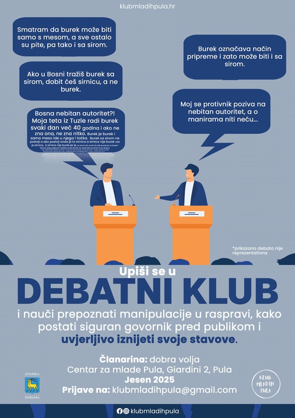 Klub mladih Pula pokreće Debatni klub za mlade – siguran i poticajan prostor za sve osobe starije od 18 godina koje žele razvijati komunikacijske i argumentacijske vještine, bez obzira n…
