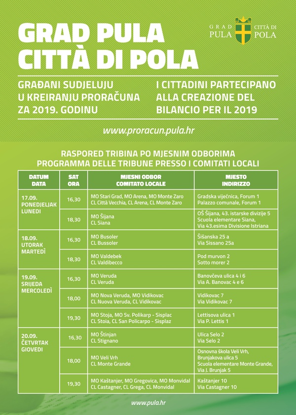 Grad Pula i ove godine organizira javne tribine po svim gradskim mjesnim odborima kako bi od samih građana prikupio prijedloge za pripremu što kvalitetnijeg gradskog proračuna za 2019. g…