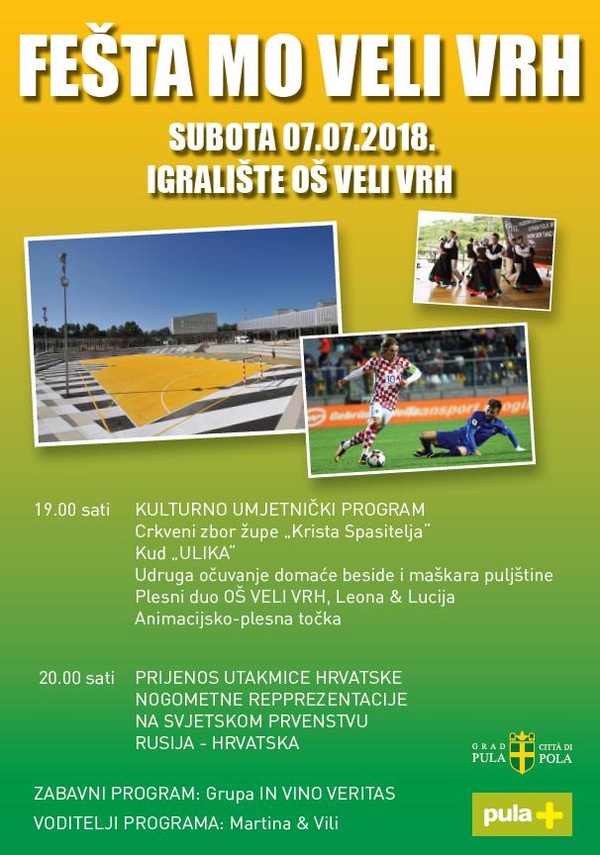 U organizaciji Mjesnog odbora Veli Vrh i udruga sa područja Veloga Vrha te uz potporu Grada Pule i Turističke zajednice Grada Pule, u subotu, 7. srpnja 2018. godine na igralištu OŠ VELI…