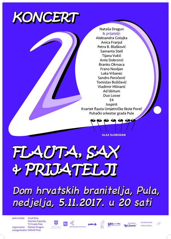 Koncert Flauta, sax & prijatelji održava se već dva desetljeća. Ovogodišnji, 20. u nizu, bit će u nedjelju 5.11.2017., u Domu hrvatskih branitelja u Puli s početkom u 20 sati. Domaći iz…