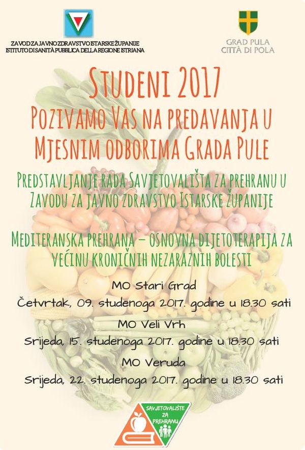 Predavanja, odnosno savjetovališta za prehranu započinju ovog studenog u tri gradska Mjesna odbora. S temom Mediterenska prehrana - osnovna dijetoterapija za većinu kroničnih nezaraznih bolest…