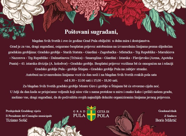Povodom blagdana Svih svetih Grad Pula je osigurao besplatan prijevoz autobusima Pulaprometa na izvanrednim linijama i to svakih pola sata ujutro od 8.30 do 11.00 sati i poslijepodne od 15.00 do 18.0…