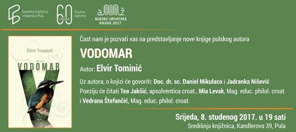 Danas u 19 sati u dvorani Središnje knjižnice održati će se predstavljanje zbirke pjesama "Vodomar" autora Elvira Tominića. O knjizi će uz autora govoriti doc. dr. sc. Daniel Mikulac…