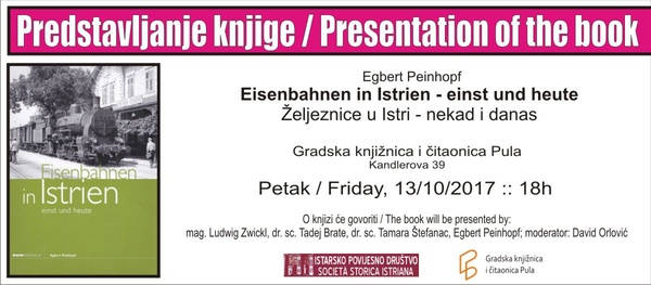 Knjiga prof. Egberta Peinhopfa "Eisenbahnen in Istrien - einst und heute“ (Željeznice u Istri – nekad i danas" bit će predstavljena u petak, 13. listopada 2017. u 18.00 sati u …