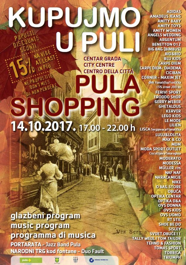 Ove subote, 14. listopada 2017., u središtu grada održati će se trgovinska akcija “Kupujmo u Puli” s radnim vremenom od 17 do 22 sata. Datum akcije povezan je uz Obrtnički sajam n…