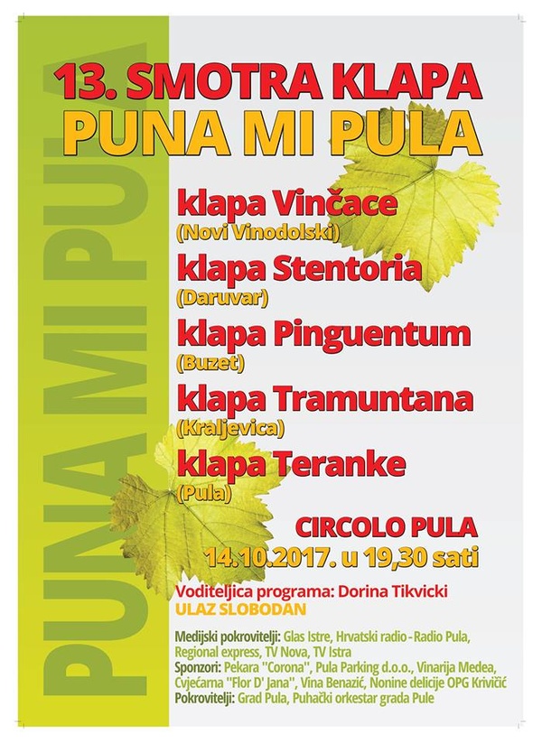 U subotu 14.10. 2017. u Circolu u Puli održati će se 13. smotra klapa Puna mi Pula s početkom u 19:30 sati. Smotru već tradicionalno organizira pulska ženska klapa Teranke pod pokroviteljstvom Grada …