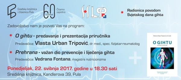 U ponedjeljak, 22. svibnja 2017. u 18.30 sati u Središnjoj knjižnici dr. med. spec. fizijatar-reumatolog Vlasta Urban-Tripović održat će predavanje i predstaviti priručnik "O gihtu",…