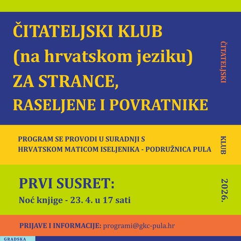 Gradska knjižnica i čitaonica Pula u suradnji s Hrvatskom maticom iseljenika - Podružnica Pula pokreće čitateljski klub na hrvatskom jeziku …