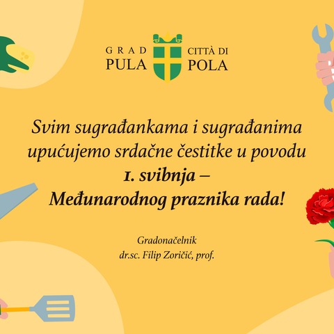 U povodu predstojećeg 1. svibnja, Međunarodnog praznika rada gradonačelnik Filip Zoričić uputio je čestitku svim građankama i građanima Pule.