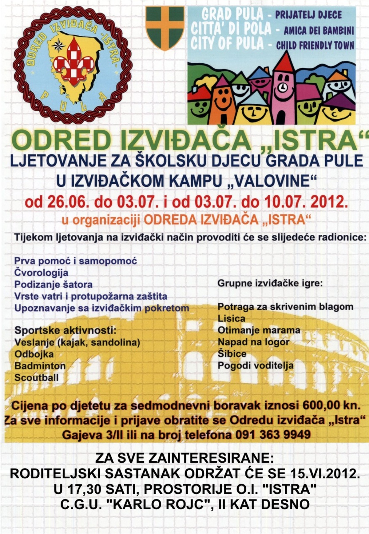 U periodu od 26. lipnja do 3. srpnja te od 3. do 10. srpnja Odred izviđača "Istra" organizira tradicionalno ljetovanje za svu školsku djecu grada Pule u izviđačkom kampu Valovine. Tijekom ljetovanja izvodit će se razne radionice poput one prve pomoći, čvorologije, podizanja šatora, upoznavanja s izviđačkim pokretom, a osim toga predviđene su i sportske aktivnosti kao što su badminton, veslanje, odbojka i scoutball.