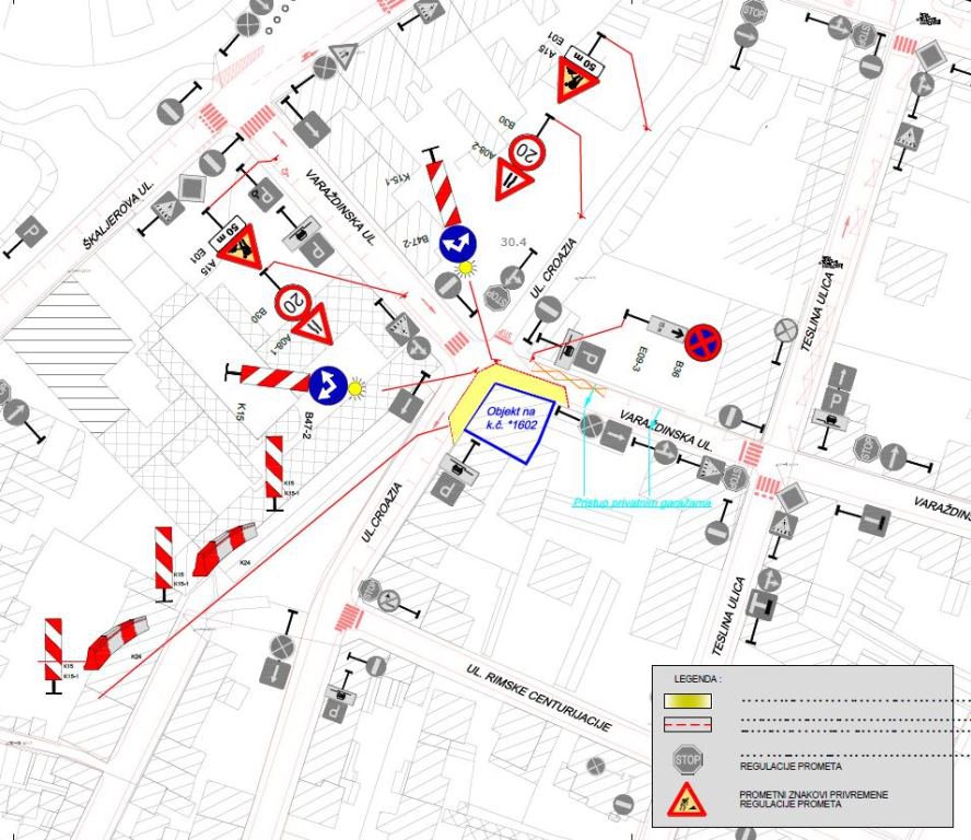 Za potrebe izvođenja radova na uklanjanju postojeće građevine uvodi se privremena regulacija prometa na raskrižju Varaždinske ulice i Ulice Croazia i to u dvije faze.