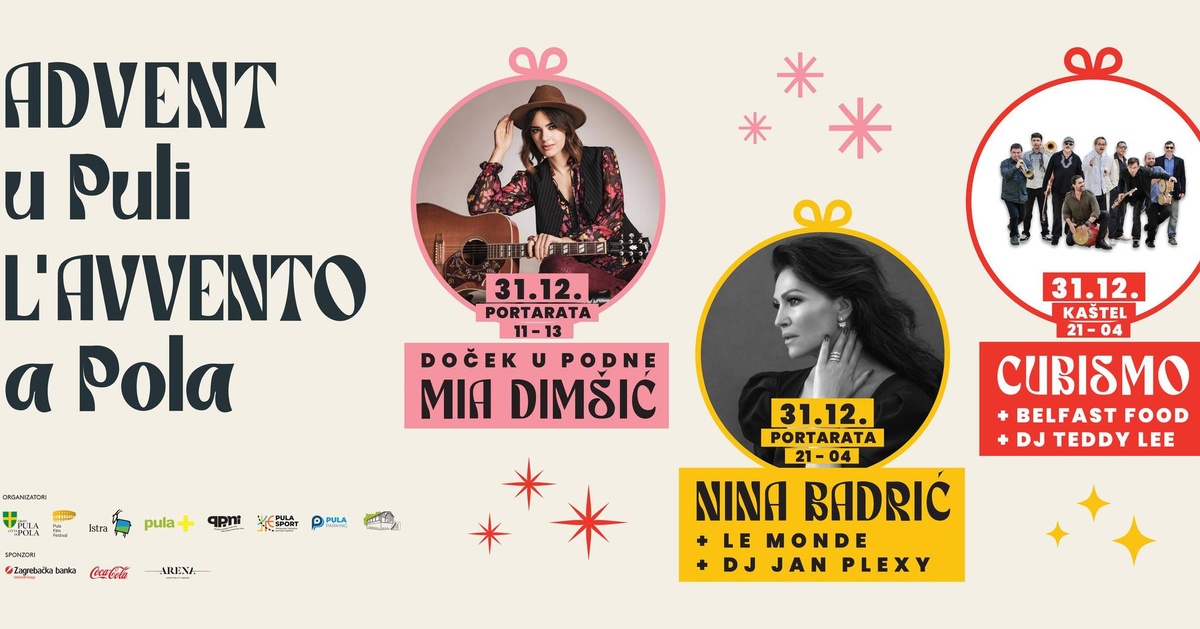 Na Silvestrovo će centar grada zapjevati i zaplesati od jutarnjih sati; na Tržnici u 10 počinje koncert Vesne Nežić Ružić i Anelida uz tradicionalnu Veliku padelu - fritaju od 2023 jaja. Doček u podne na Portarati započinje u 11 sati nastupom simpatične pop kantautorice Mije Dimšić. Puljane i Puljanke očekuju i dva fantastična večernja dočeka Nove godine i to na Portarati s Ninom Badrić, Le Monde i DJ Jan Plexy a na Kaštelu će godinu ispratiti Cubismo uz Belfast Food i DJ Teddy Lee.