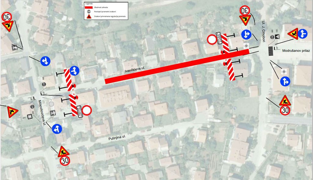 Zbog dinamike izvođenja radova Izvođač će radove izvoditi u jednoj fazi, na način da će se zatvoriti dio Ivančićeve ulice od raskrižja s Mihovilovićevom ulicom sve do raskrižja s Ulicom Jasne Crnobori, te će obilazni pravac biti osiguran preko Valdebečkog puta. Stanare će se usmjeravati da privremeno parkiraju svoja vozila na parkiralištu multifunkcionalnog igrališta na Valdebeku.