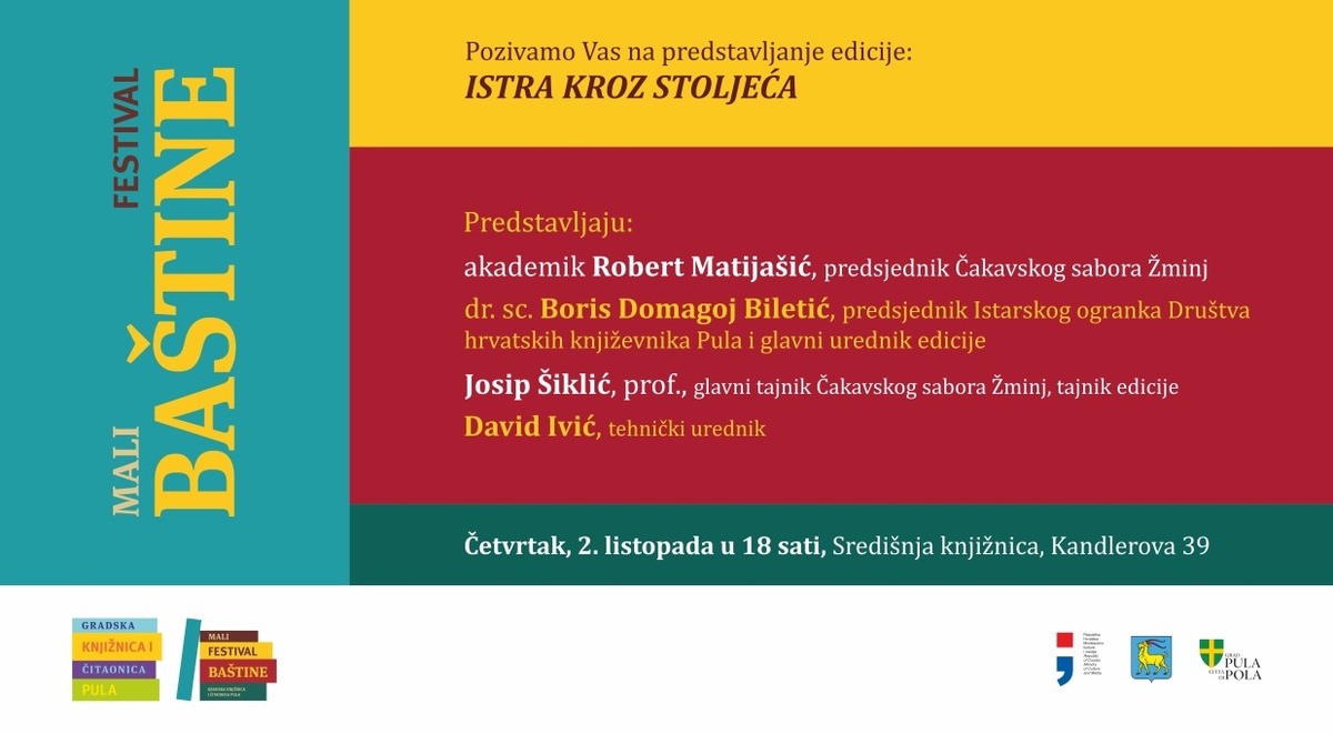 U okviru manifestacije Mali festival baštine u četvrtak, 2, listopada 2025. u dvorani Središnje knjižnice bit će predstavljena edicija Istra kroz stoljeća.