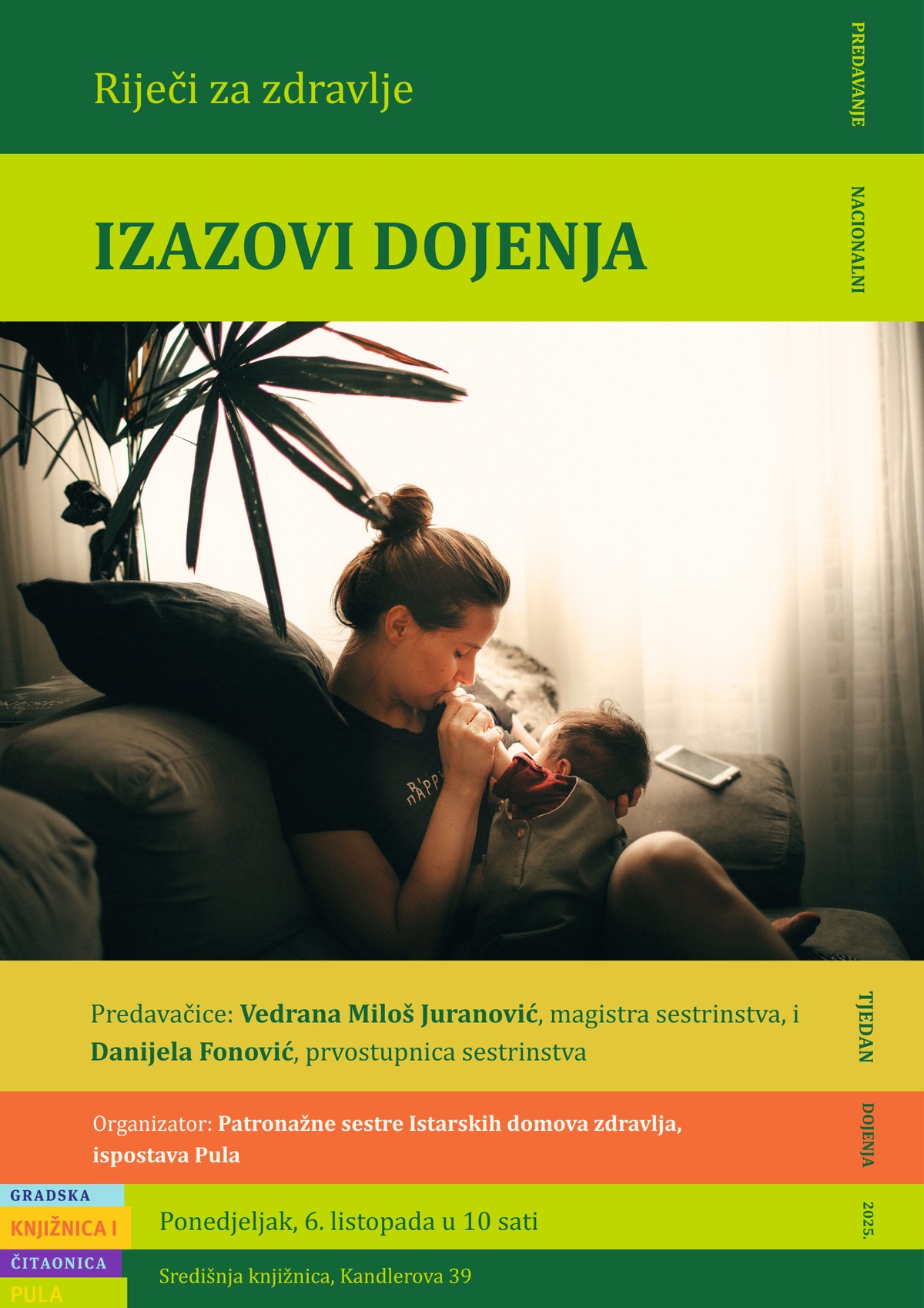 Nacionalni tjedan dojenja, koji se obilježava u prvom tjednu listopada, bit će obilježen u ponedjeljak, 6. listopada 2025. predavanjem o izazovima dojenjakoje će održati Vedrana Miloš Juranović, magistra sestrinstva, i Danijela Fonović, prvostupnica sestrinstva, u dvorani Gradske knjižnice i čitaonice Pula.