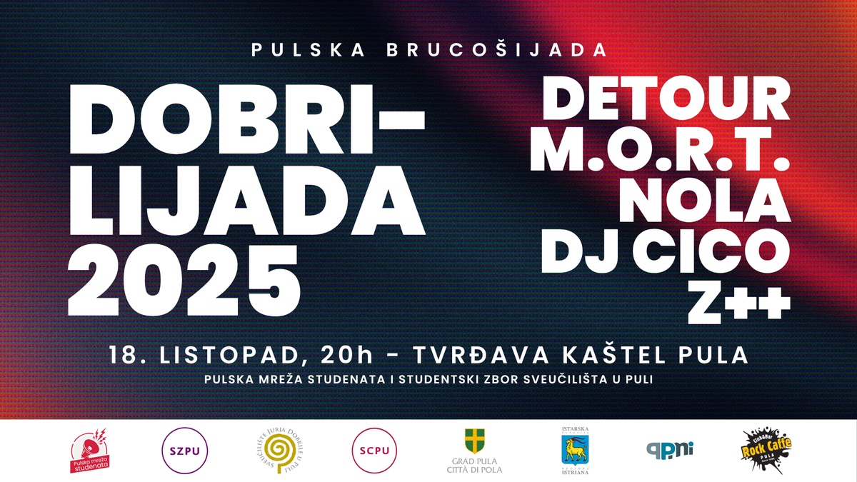 Posjetitelje očekuje bogat glazbeni program i nezaboravna koncertna večer uz nastupe izvođača Nola, Detour, M.O.R.T., Z++ te DJ Cice. Dobrilijada već tradicionalno spaja dobru glazbu, zajedništvo i pozitivnu energiju, stvarajući jedinstvenu atmosferu za sve studente i građane Pule.