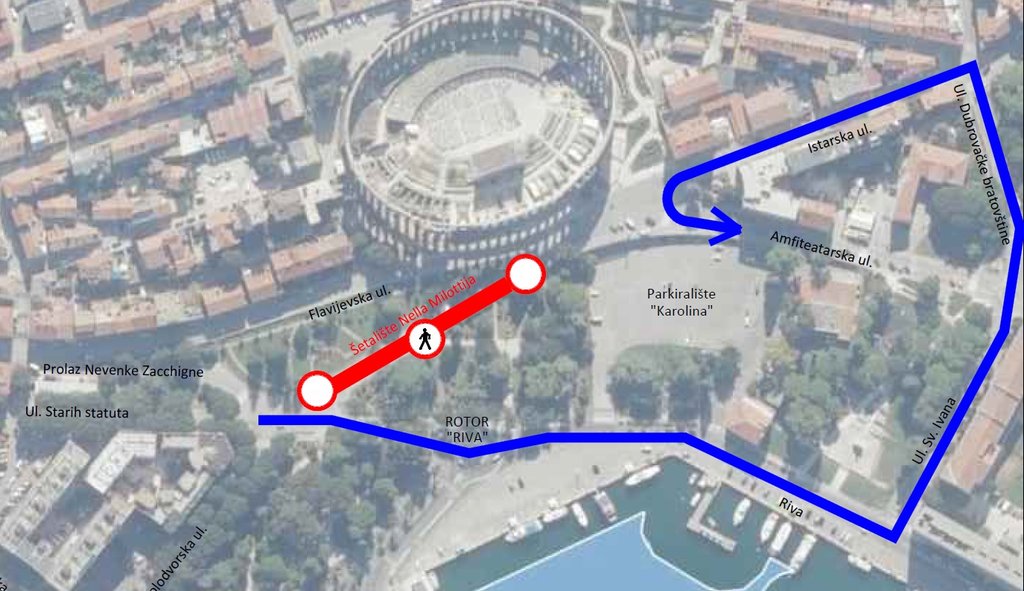 Zbog izvođenja radova uspostavlja se privremena regulacija prometa, kojom se zatvara dionica Šetališta Nella Milottija, u dužini od oko 130 metara, od kružnog raskrižja s Ulicom Starih Statuta do raskrižja s Flavijevskom ulicom. Dionica će biti zatvorena za sav promet, osim za vozila gradilišta. Obilazni pravac bit će osiguran preko Ulice Riva, Ulice sv. Ivana, Ulice Dubrovačke bratovštine i Istarske ulice.