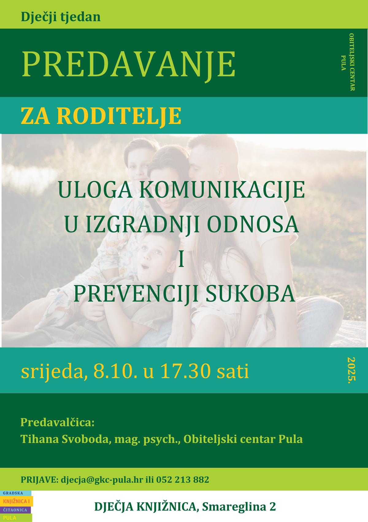 Predavanje počinje u 17.30 sati, a zbog ograničenog broja sudionika potrebno je prijaviti dolazak na: djecja@gkc-pula.hrili 052 213 882.