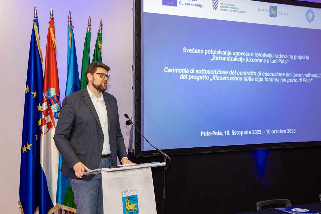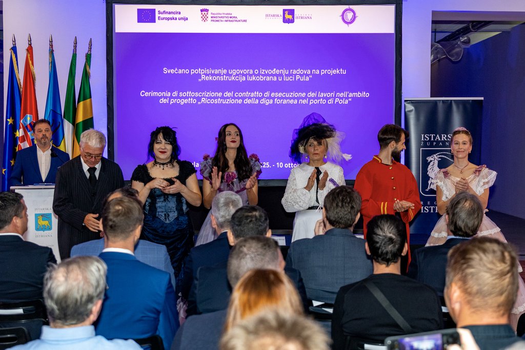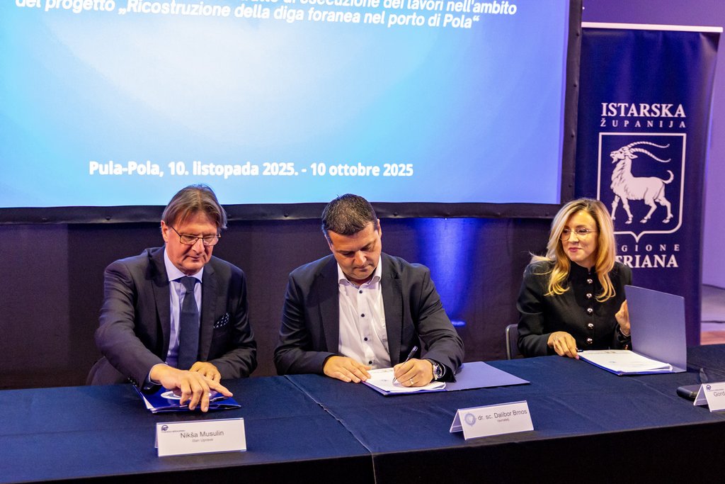 U Muzeju suvremene umjetnosti Istre, danas je održana svečanost potpisivanja ugovora o izvođenju radova na projektu „Rekonstrukcija lukobrana u luci Pula“, čiji je nositelj Županijska lučka uprava Pula, uz potporu Ministarstva mora, prometa i infrastrukture te Istarske županije, a o čijem su značaju govorili župan Istarske županije Boris Miletić, gradonačelnik Pule Peđa Grbin, voditelj Službe za strateško planiranje i razvoj projekata pri Upravi za EU fondove i strateško planiranje Ministarstva mora, prometa i infrastrukture Marko Boban, ravnatelj Županijske lučke uprave Pula Dalibor Brnos te član Uprave POMGRAD INŽENJERING d.o.o. Nikša Musulin.