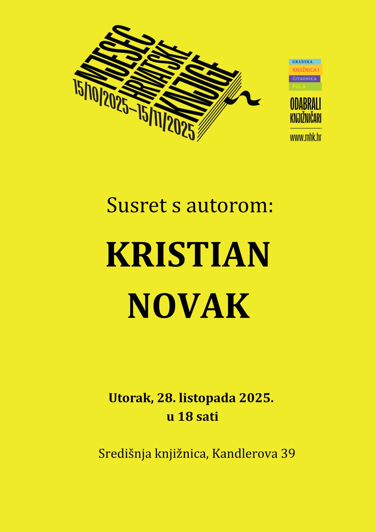 Kristian Novak gostovat će u Gradskoj knjižnici i čitaonici Pula u utorak, 28. listopada 2025. godine. Program počinje u 18 sati i ulaz je slobodan.