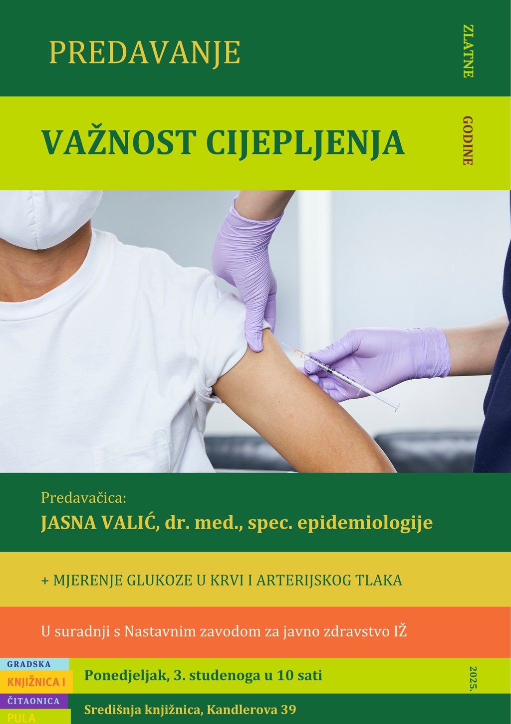 Jasna Valić, dr. med., spec. epidemiologije održat će predavanje Važnost cijepljenja u ponedjeljak, 3. studenoga 2025. u Gradskoj knjižnici i čitaonici Pula (Kandlerova 39).