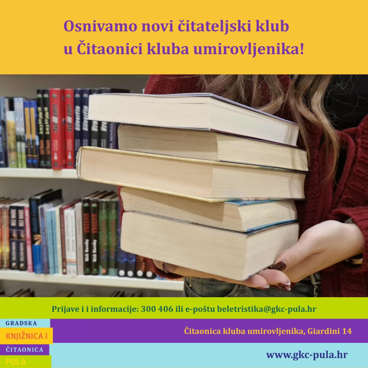 Gradska knjižnica i čitaonica Pula pokreće novi čitateljski klub namijenjen umirovljenicima – mjesto gdje se ljubav prema knjigama spaja s druženjem, razmjenom iskustva i stvaranjem novih prijateljstava. Pozivamo ljubitelje knjiga i razgovora o pročitanime da postanu dio naše zajednice čitatelja koji žele aktivno sudjelovati u kulturnom i društvenom životu grada.