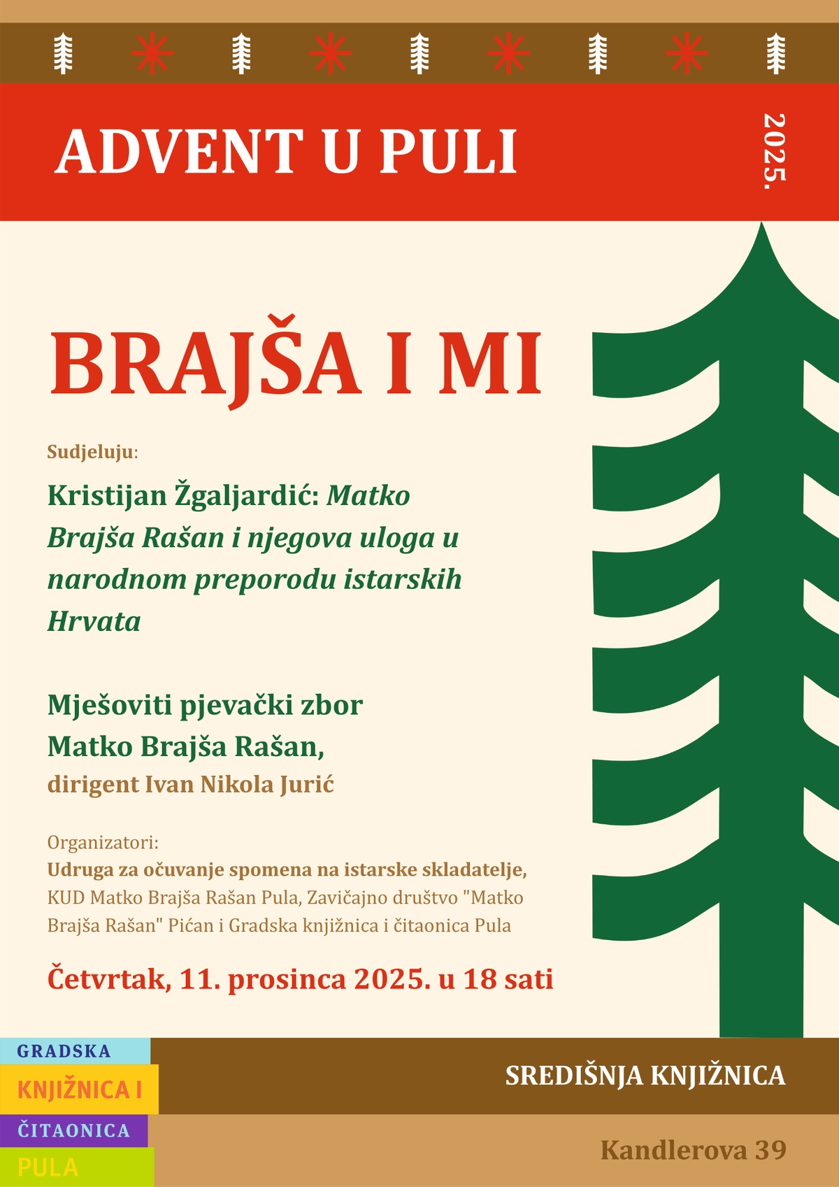 U četvrtak,11. prosinca 2025.u dvorani Gradske knjižnice i čitaonice Pulabit će održan višegodišnji program Udruge za očuvanje spomena na istarske skladateljeBrajša i mi.