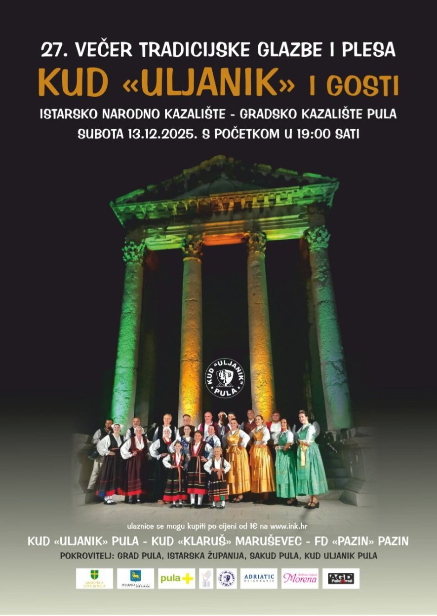 Sutra s početkom u 19 sati, u Istarskom narodnom kazalištu – Gradskom kazalištu Pula, održat će se 27. večer tradicijske glazbe i plesa u organizaciji KUD-a „Uljanik“ i njihovih gostiju.