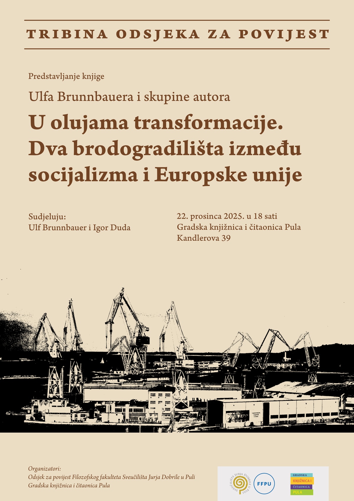 Odsjek za povijest Filozofskog fakulteta Sveučilišta Jurja Dobrile u Puli i Gradska knjižnica i čitaonica Pula organiziraju predstavljanje knjige Ulfa Brunnbauera i skupine autora U olujama transformacije. Dva brodogradilišta između socijalizma i Europske unije u ponedjeljak, 22. prosinca 2025. u 18 sati u Središnjoj knjižnici, kao dio programa Tribine Odsjeka za povijest.