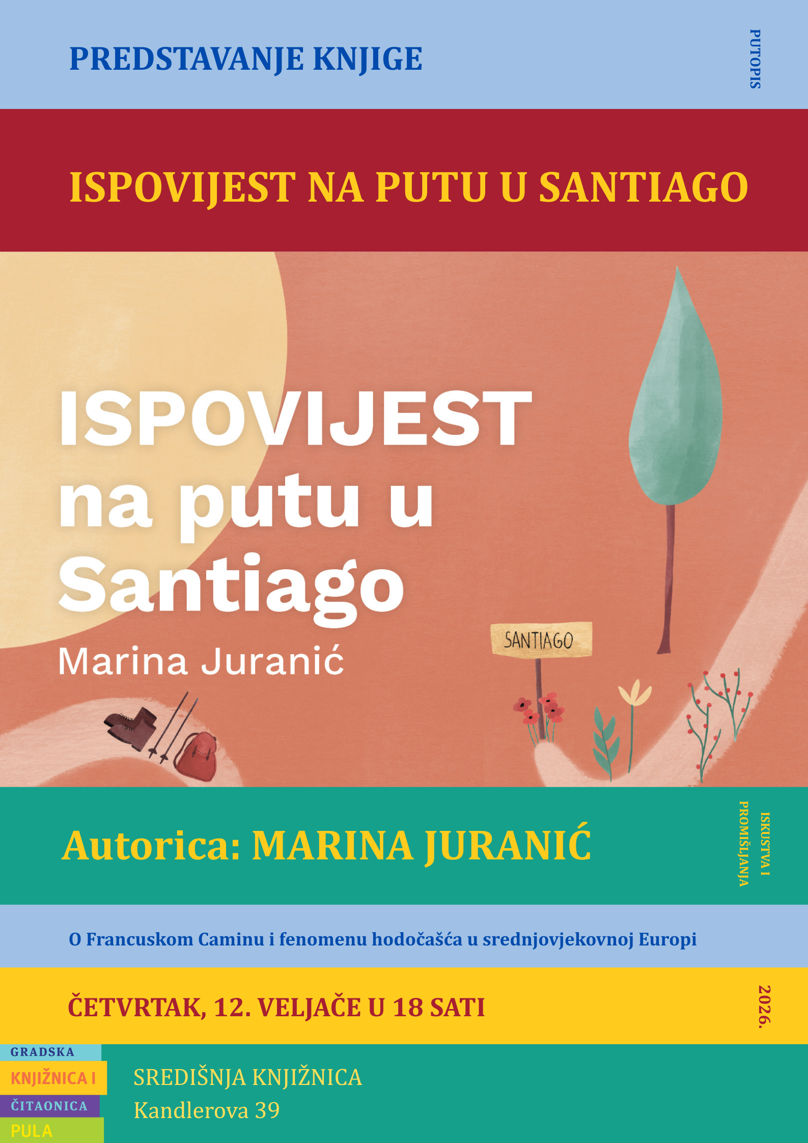 U četvrtak, 12. veljače 2026. u dvorani Središnje knjižnice Marina Juranić predstavit će svoju knjigu Ispovijest na putu u Santiago te kroz niz fotografija Francuski Camino i govoriti o fenomenu hodočašća u srednjovjekovnoj Europi.