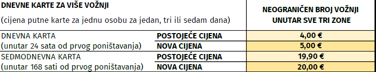 Tablica 2 – dnevne karte - usporedba postojećih i novih cijena (€) sa PDV-om