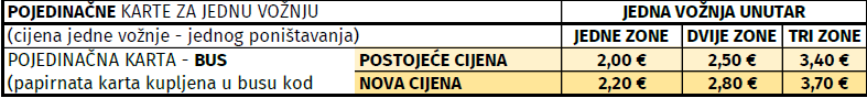 Tablica 1 – pojedinačne karte - usporedba postojećih i novih cijena (€) sa PDV-m