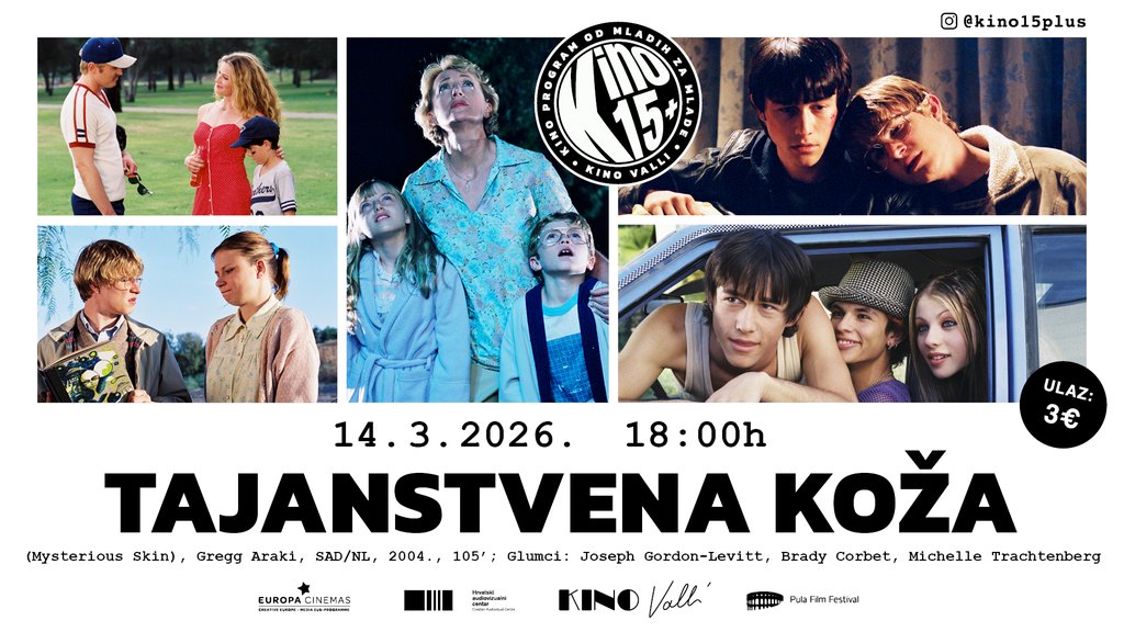 Mladi tim Kina 15+u ožujku je predvidio projekciju filma „Tajanstvena koža“(Mysterious Skin) iz 2004. godine redatelja Gregga Arakija. Radi se o filmskoj adaptaciji istoimenog romana Scotta Heima i priči o dva mladića koji odrastaju krajem osamdesetih godina u Kansasu koje povezuje traumatično iskustvo iz djetinjstva.