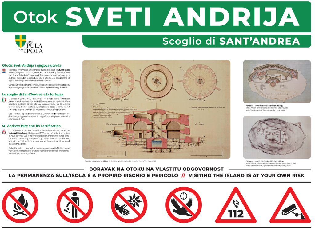 Grad Pula-Pola i Pula Herculanea pritom naglašavaju kako otok nije uređen kao javni prostor niti kao turistička destinacija, već je riječ o prirodnom i djelomično neuređenom području. Sukladno tome, boravak na otoku i dalje je na vlastitu odgovornost, što je naznačeno i na postavljenoj informativnoj tabli.