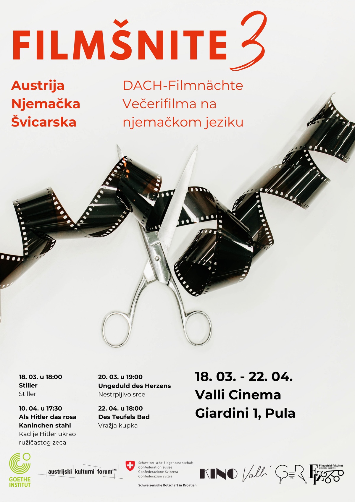 Festival filmova na njemačkom jeziku u pulskom Kinu Valli realizira se u suradnji s Katedrom za strane jezike pri Fakultetu ekonomije i turizma „Dr. Mijo Mirković“, Sveučilište Jurja Dobrile u Puli i održavat će se od 18. ožujka do 22. travnja 2026. godine kada publiku očekuje ukupno četiri projekcije.