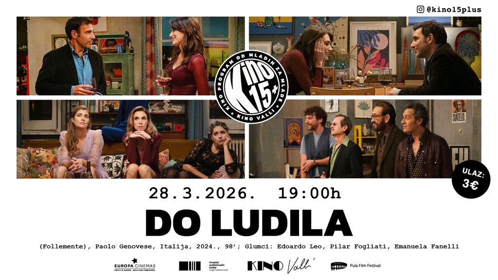 Mlada ekipa okupljena oko projekta Kino 15+ ovoga se puta odlučila na prikazivanje talijanske romantične komedije Do ludila(Follemente), hit iz 2025. godine. Priča prati prvi spoj Piera i Lare te otkriva dinamiku kojom se koriste kako bi se povezali, razumjeli jedno drugo, možda vodili ljubav te možda započeli vezu. Scenarij i režiju potpisuje Paolo Genovese, poznat po nacionalnom blockbusteru„Potpuni stranci“ koji je ušao u Guinnessovu knjigu rekorda s najviše remakeovau povijesti, od Europe do Azije.