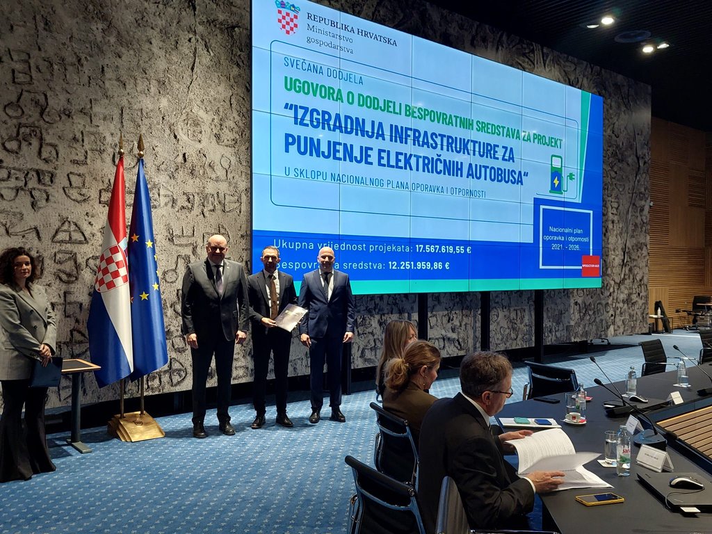 U Nacionalnoj i sveučilišnoj knjižnici u Zagrebu danas je održano svečano uručenje ugovora o dodjeli bespovratnih sredstava za projekt izgradnje i opremanja infrastrukture za električne autobuse. Ugovor je direktoru Pulaprometa Tomislavu Josipoviću uručio ministar gospodarstva Ante Šušnjar.