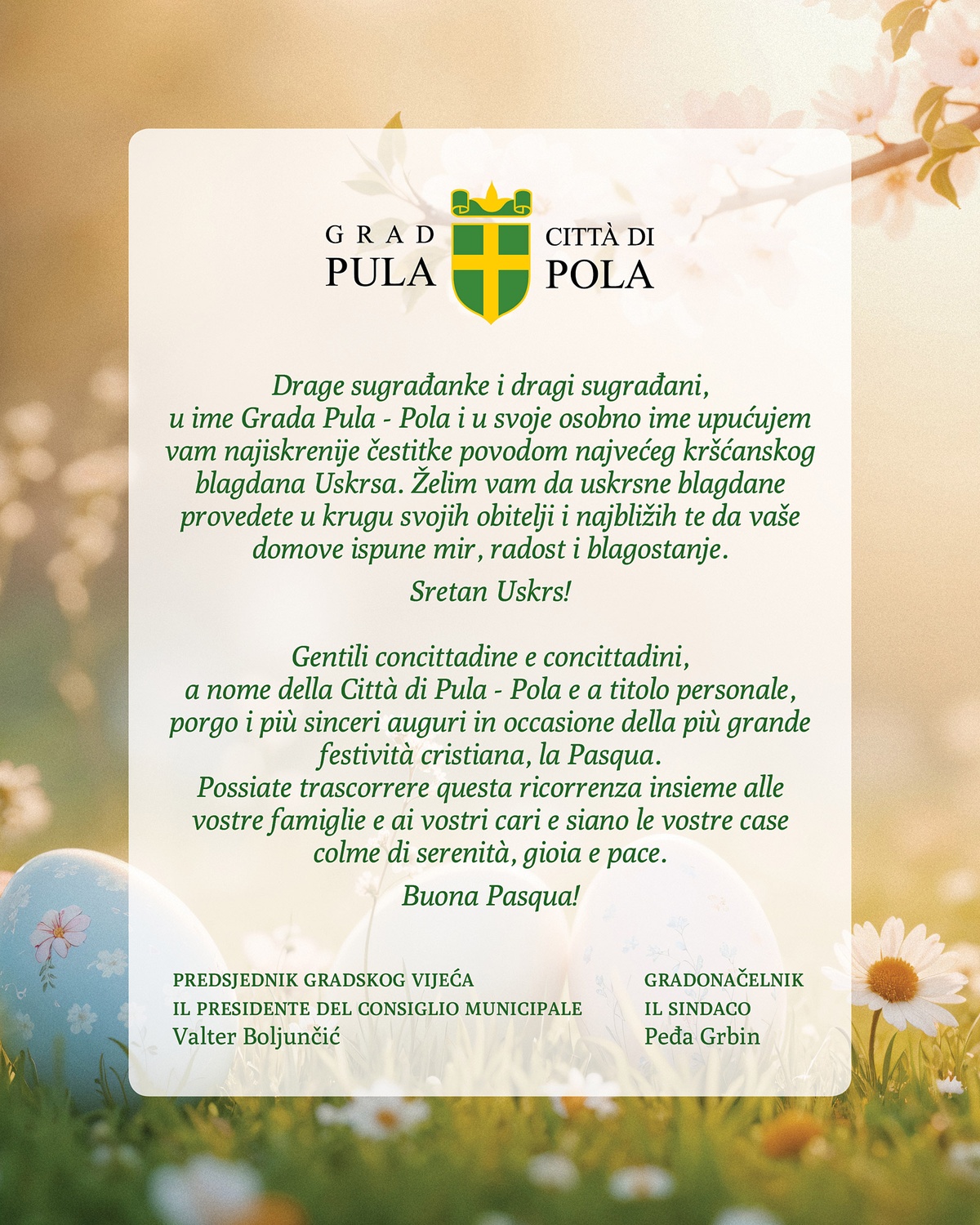 u ime Grada Pula - Pola i u svoje osobno ime upućujem vam najiskrenije čestitke povodom najvećeg kršćanskog blagdana Uskrsa.