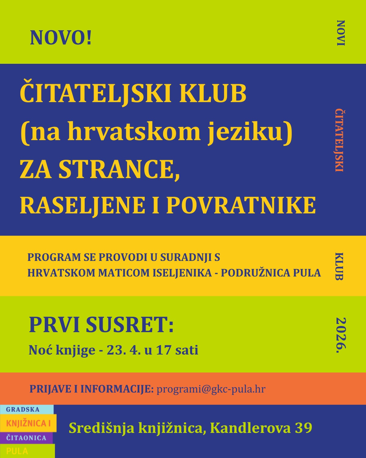 Gradska knjižnica i čitaonica Pula u suradnji s Hrvatskom maticom iseljenika - Podružnica Pulapokreće čitateljski klub na hrvatskom jeziku namijenjen strancima, raseljenima i povratnicima.