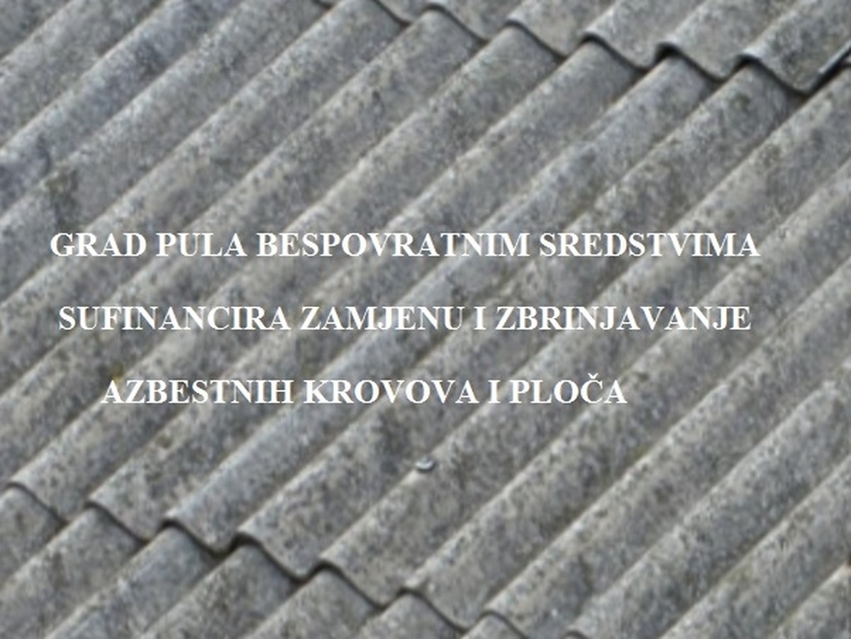 Grad Pula objavljuje Javni poziv za dostavu prijava za sufinanciranje zamjene krovnih pokrova koji sadrže azbest i zbrinjavanja azbestnih ploča s lokacija na području grada Pule. Naime, Grad Pula će zamjenu krovnog pokrova koji sadrži azbest sufinancirati bespovratnim novčanim sredstvima u iznosu od 100,00 kn/m2 uklonjenog i zamijenjenog azbestnog krovnog pokrova, do maksimalno 10.000,00 kuna po prijavi te u iznosu od 2,5 kn/kg za zbrinjavanje (odvoz) azbestnih ploča, do maksimalno 5.000,00 kuna po prijavi.