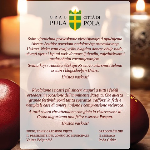 Uskršnja čestitka gradonačelnika Peđe Grbina i predsjednika Gradskog vijeća Valtera Boljunčića vjernicima pravoslavne vjeroispovijesti