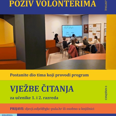 Odjel za djecu i mlade Gradske knjižnice i čitaonice Pula poziva zainteresirane volontere na suradnju u realizaciji programa Vježbe čitanja. …