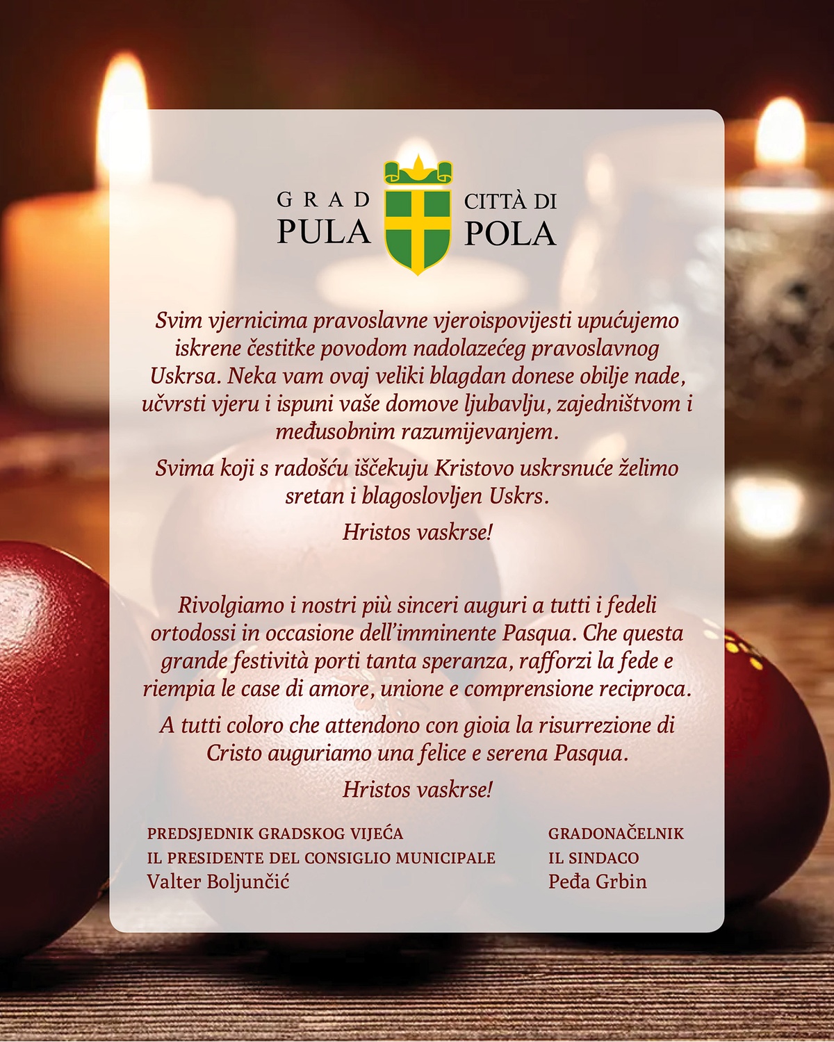 Vjernici pravoslavne vjeroispovijesti prema julijanskom kalendaru u nedjelju, 12. travnja 2026. godine proslavit će blagdan Uskrsa. Tim su povodom, gradonačelnik Peđa Grbin i predsjednik Gradskog vijeća Valter Boljunčić uputili blagdansku čestitku svim vjernicima koji Uskrs slave po julijanskom kalendaru.
